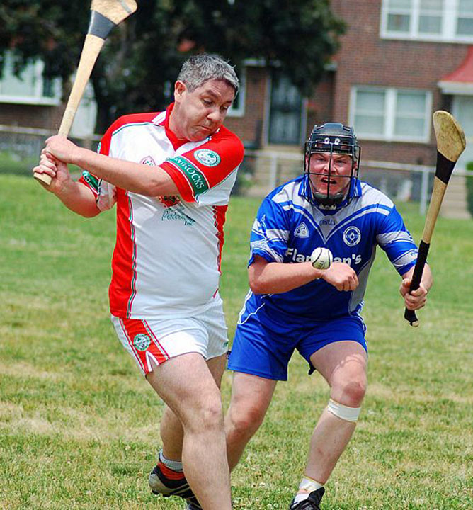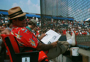 Ralph Kiner Artifacts Treasures from my Youth (click to enlarge) I can never quite relate to these antiseptic new ball fields, even the retro-themed ones like Camden yards. I prefer minor league baseball, especially the Frederick Keys. Relaxing at a Frederick Keys Game (click to enlarge) Here I am, sitting behind Home Plate relaxing with a scorexard and a cup of coffee. The seats were $5 after I showed my Safeway Savings Card. HurlingWhen I was in the oil business, I had to do a lot of traveling. One of my trips brought me to Ireland where I was introduced to the sport of hurling. At the risk of being culturally insensitive, my first impression was that the game consisted of big guys hitting each other with nasty looking sticks. After watching the game for a while, and becoming more familiar with it, I found it to be quite interesting -- a lot more exciting than soccer. I even spent some time on a weekend trying my hand at it; some of my experience with lacrosse (below) transferred, so I didn't make a complete fool of myself. The bruises that i got confirmed that it is a contact sport, but I came away with (a) an appreciation of the skill required and (b) a souvenir caman, as shown below.