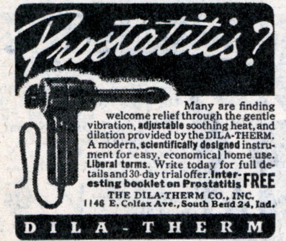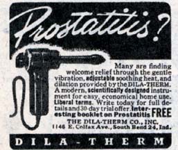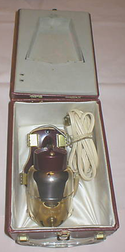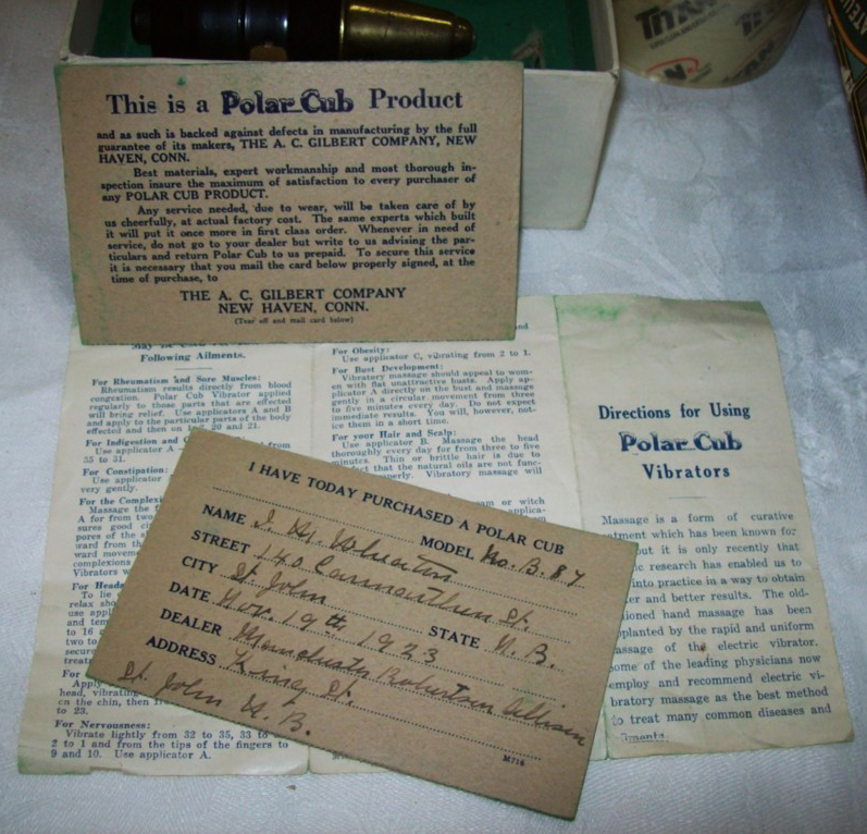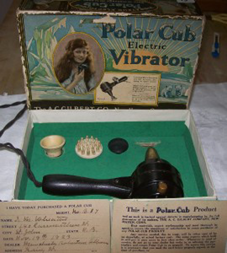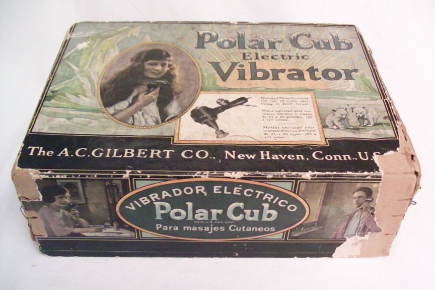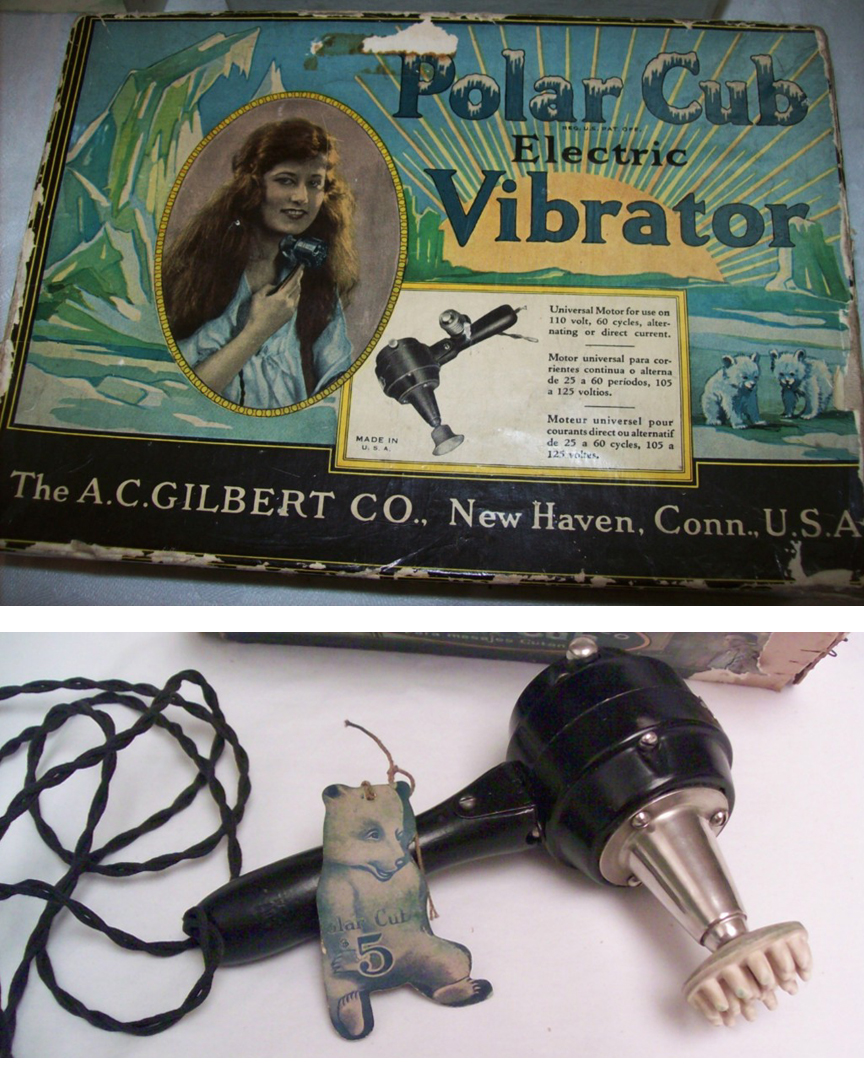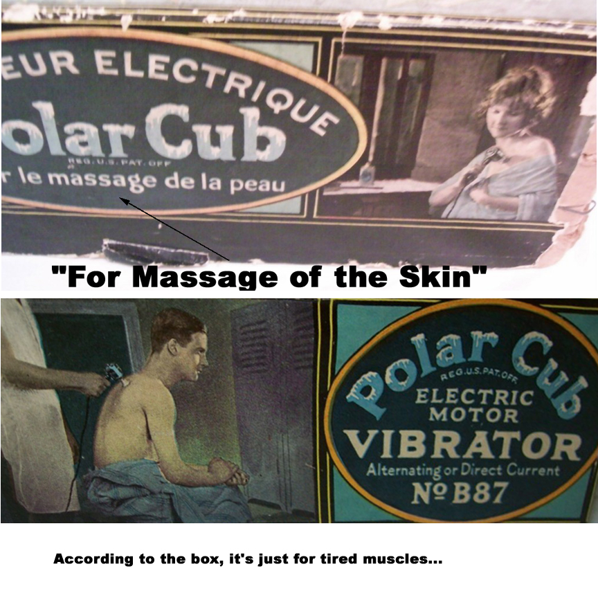 A Very Early Polar Cub Vibrator Notations in French Cures "nervousness" and "develops the bust" Click Photo to Enlarge It At the time this vibrator was produced, there was little standardization in the electricity industry. Some homes were wired from the attic through the ceiling and had light sockets hanging down. Appliances had to be connected with a screw-in plug that looks like the base of a light bulb. Other houses were wired from the basement through the floor and used the now familiar two-prong plug. Mr. Gilbert gave the customer both. (just in case the boudoir had been wired from the attic...) Here are photos of a copycat device manufactured by the Bersted Company, the "Knockoff Kings.". The Eskimo Vibrator Check out our Web Page on More of Mr. Bersted's knockoffs Your first reaction (as was mine) was probably something like "This is a thing for sore muscles." Certainly, the box for the Eskimo vibrator would lead you to that conclusion... Au contraire, records from the Gilbert company indicate that this thing was intended for another part of the body. According to Bruce Watson (op. Cit), there is a nine-page document in the Gilbert archives that describes this appliance and its purpose: "... One object of the invention is to provide a means by which married people can enhance sexual excitement with each other so as to enjoy completion of normal sexual intercourse with the least expenditure of time and energy..." The document goes on to describe the function of body organs and glands (Gilbert was a Yale M.D.), ending with: "... without proper stimulation... sex can become a chore. and every excuse is used to avoid this obligation ... the vibrator is the quick and simple solution..." Apparently (according to Watson), Gilbert field tested the gadget amongst his friends and reported: "... all couples have admitted that their sexual retationships have immesurably improved. Husbands feel proud of their new ability to satisfy their wives. Small and picayune differences are quickly thrust aside. The Wife is now extremely happy and content with marital life. The Husband is proud of his new prowess ..." A little bit of Internet research has revealed that the first vibrator could have been made in the 1850s and was steam powered (perhaps it came with a notation on the crate "Coal not included.") From my limited experience with steam engines, this was not something that a lady might use for a quiet interlude. Most Internet sources credit a British physician with inventing a wind-up version of the vibrator in 1880. I can imagine a moment of Victorian ardor in which the thing runs down and has to be rewound at a critical moment (possibly accompanied with fumbling for the key...) So, Mr. Gilbert is, more properly, the inventor of the electric vibrator. From this point, a discusssion of the vibrator becomes clouded by Feminist politics. A number of Internet sources are noticeably hostile in discussing the issue. One source seeks to remove the vibrator from the nightstand drawer to a prominent place on the coffee table. I didn't find anyone arguing against the vibrator, so Mr. Gilbert has probably done the world a net good by inventing the gadget. These wren't intended just for the ladies, either. I found this ad for what appears to be a dead-on knockoff of Mr. Gilbert's invention being touted as a treatment for prostatitis. It appeared in the October, 1949 issue of Detective World, a less-well-known journal of scientific fact: ![]() The male equivalent of the "cure for sore muscles" From the October 1949 Issue of Detective World Click on Either Photo to Enlarge it Apparently, Mr. Gilbert knew boys and girls.