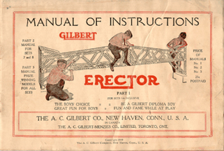 Displays of Gilbert Products left: Ferris Wheel; middle: No. 81/2 kit with Hudson right: Hudson locomotive and Tender assembled Click to Enlarge This is a great way to spend a couple of hours. Read what others have to say about A.C. Gilbert. There is a five page article in the November 18, 1946 issue of LIFE Magazine entitled "Alfred Carlton Gilbert, Toy King." I have obtained this issue and scanned it for you. ![]() Headline from the 11-18-1946 LIFE Magazine Article Read the 1946 LIFE Magazine Article The Erector Sets were always popular toys that kept boys interested. They were a radical departure from the run-of-the-mill single purpose toys that had generally been offered to children. Gilbert's methods of instruction were the inspiration for at least one doctoral dissertation. We have obtained a scan of "The Educational Value of Certain After School Activities", a 1921 dissertation. Dissertation on Gilbert Methods Click to Download the ".PDF" Occasionally, files held on the server may be corrupted-- if you find that this is the case with your download, please contact me and I'll send you the correct file. A.C. Gilbert is revered by legions of Boys who never met him -- mainly because his advertising campaigns placed him in the role of an Ideal Father. This view has been challenged. You might want to look at another side of the Gilbert enterprise as presented by Craig O'Connell Thanks to the Reverend Arnold Taylor, I have come into possession of a marvelous book: Viking, New York (2002), ISBN 0-670-03134-8. Read the review of Bruce Watson's Book Sadly, the Erector Sets of yore could not be sold to children today -- the parts are painted with lead-based paint and the vast array of "small parts" might be a choking hazard. Worse yet, these toys foster individuality -- the Boy had to read the blueprints and figure it out for himself. There were no androgynous committees of well-socialized tykes to put these things together. If you had to ask for help, you were a schmuck, a dolt, a doofus, or a weenie and you probably tried to get out of gym using allergies for an excuse. Today the Nanny State (Lawyers, Bureaucrats, the Public Schools, and Concerned Moms) seems like it is organized to prevent Boys from being self-reliant. I'd like to take a minute to take a look at what can happen when the Nanny State keeps Boys from being Boys. Most of the good things that we have come from Science and Industry. Many scholars have attributed the Scientific and Industrial Revolutions in the West to three things: printing, the compass, and gunpowder. Historians now know that all three were invented in China. Unlike Europe, China did not take off onto a path leading from the scientific to the Industrial, leading to the question: Why were these inventions were so revolutionary in Western Europe and, apparently, so unrevolutionary in China? Some have suggested that an insidious team-oriented Civil Service kept China from using the fruits of her inventiveness since commerce was considered less exalted than elite positions in the stratified government.(Others dispute this.) Durng this period of intense scientific progress, landscape art and portrait paintings were brought to new levels of maturity and complexity. Social elites gathered to view art, share their own, and make trades of precious artworks.(Doesn't this sound like today's earth-friendly crowd of Lawyers, Bureaucrats and Concerned Moms?) I note that it is only now that the Chinese nation is waking up and allowing her Boys to make all the things that are lumped under the heading "Heavy Industry." At the same time, the cultural elites are forcing American Boys into a passive, group oriented mold. How many Concerned Moms would smack their Boy if he picked up a hammer instead of a law book? The Boy who yearns to make things is drugged as "hyperactive" until he learns to sit with his hands folded and listen. It is no wonder that the USA is losing its pre-eminence -- all the big factories, dams, bridges, and buildings are going up somewhere else while we preserve the Snail Darter. This weekend, the Post thought that it was important to profile a woman who was a butterfly farmer. Wouldn't it be nice if the media profiled a guy who started a steel mill and provided 5,000 jobs? My effort here will be worthwhile if they inspire just one Boy to say "I don't care what the group says, I know that I can do it!" Maybe if enough American Boys read this and have the experience of making something permanent and tangible, they will go on to lead the USA back to actually producing something. The "Boy" movement wasn't limited to the United States -- it was very much alive in the United Kingdom. Over there, metal construction sets were known as Meccano and the principal "Gee Whiz" future-tech magazine was known as Modern Wonder. Here's an informative little video that shows all the covers from Modern Wonder during the 1930s. You can get the idea -- lots of high-testosterone Technology helping Man (and Boy) conquer Nature. INSTRUCTIONS