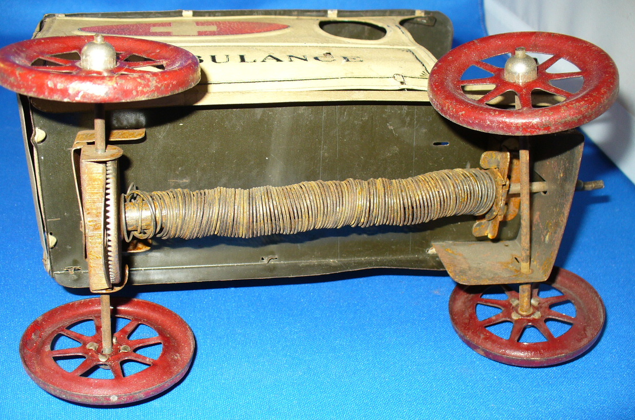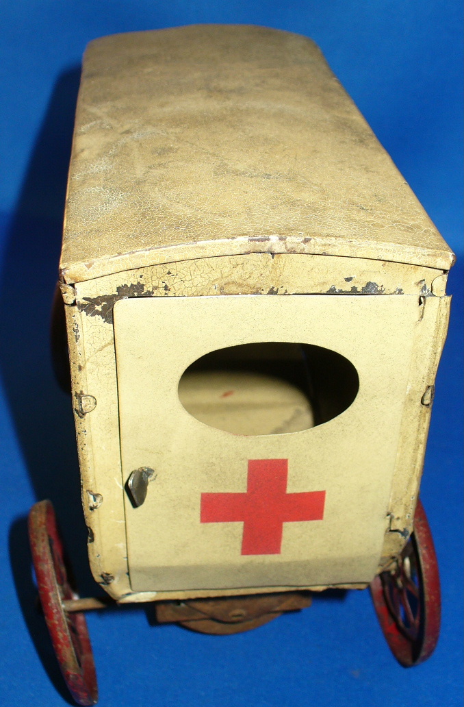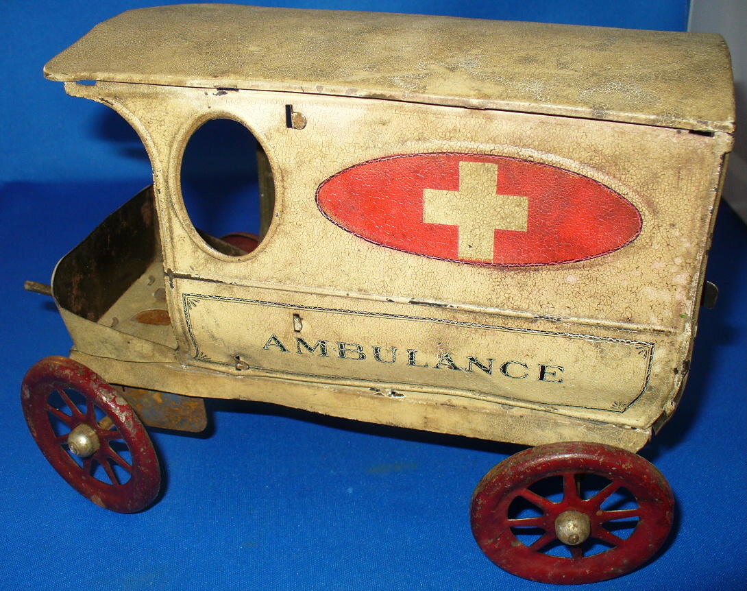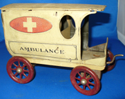 The Erector Set and Christmas 1927 Letter to Santa, 1949 Advertisement "The One Big Present He Looks Forward To" Click to Enlarge While he was saving Christmas with Erector Sets, Gilbert also manufactured wind-up toys. Here, from the critical period in the war is the 1917 World War motorized Ambulance Toy. The crank on the front is used to wind the spring for the motor. It is supposed to have a driver, but we have never seen one. The ambulance is 8 1/2" long. We suspect that the rear door has been replaced. The Lindstrom Co made a very similar toy van without the the oval windows.