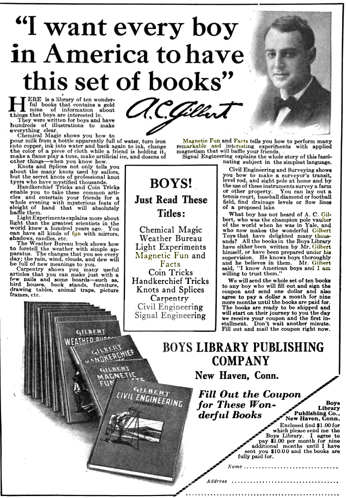 A.C. Gilbert Featured in Nov 1953 Popular Mechanics Article Right: Erector Set ad from the same issue Click to Enlarge When Mr. Gilbert passed away, the company was continued by his son. Unfortunately A.C. Gilbert Jr. was just "Al" and never "Mr. Gilbert." The impact of Television was pronounced and many of the Gilbert products seemed to be hopelessly out of date. Various attempts were made to "modernize" the product or to create tie-ins with popular television programs and films. The company moved away from its identification with the "boy" and met an ignomous end by selling Dolls (i.e. "action figures") to Boys. From the beginning, Mr. Gilbert addressed his ads to the ideal Boy -- a person who could be challenged to do great things. Mr. Gilbert provided the Boy with tools and projects that allowed the Boy to fulfil his fantasies of adult achievement. The Erector Set and American Flyer trains were advertised by appealing to the Boy's desire to construct his own little world. Gilbert sold toys on the basis that they were "Just like real [chemists, engineers, carpenters, etc} use." As you will see, ads for Gilbert products stress that they are a serious representation of glamorous adult activity, maybe only a bit smaller. Ads were notorious for misrepresenting the scale of projects that could be made with an Erector Set. To a degree, Gilbert toys were head and shoulders above the competition in flexibility and in the intellectual content of accompanying books and manuals. These materials are so well-written that I offer some of them as downloads so that you can form your own opinion about their quality. Gilbert may have exaggerated, but he never talked down to the Boy. His ads encouraged the Boy to believe that his parents would be pleased when he used the toy to construct useful things. He promised that the Boy's peer group would be thrilled with his toy. "Imagine how their eyes will pop when they see the big red brass-bound chest," read an advertisement for a Gilbert "Big Boy Tool Set." Thus, having approached the Boy with Role Play, Parental Approval, and Peer Group Recognition, Mr. Gilbert never forgot that the Boy had other interests. He encouraged all Boys to occasionally put down their toys and play at sports. Often his ads offer a sports-related premium for purchases. Boy Engineering from the 1921 Popular Mechanics Click to Enlarge In addition to all of this, the Gilbert Company wrote very clear and understandable manuals to go along with the science and construction kits. These books, advertised above as the "Boy Engineering" series never talked down to the Boy. I have made a point of collecting these and I have placed those that I have found on this site for you to read. These include: