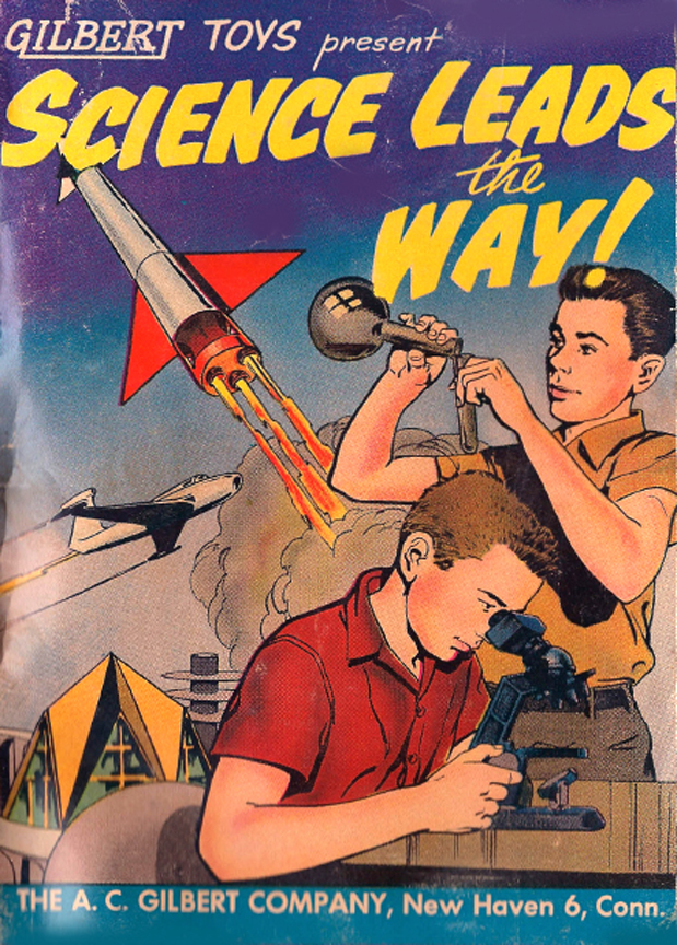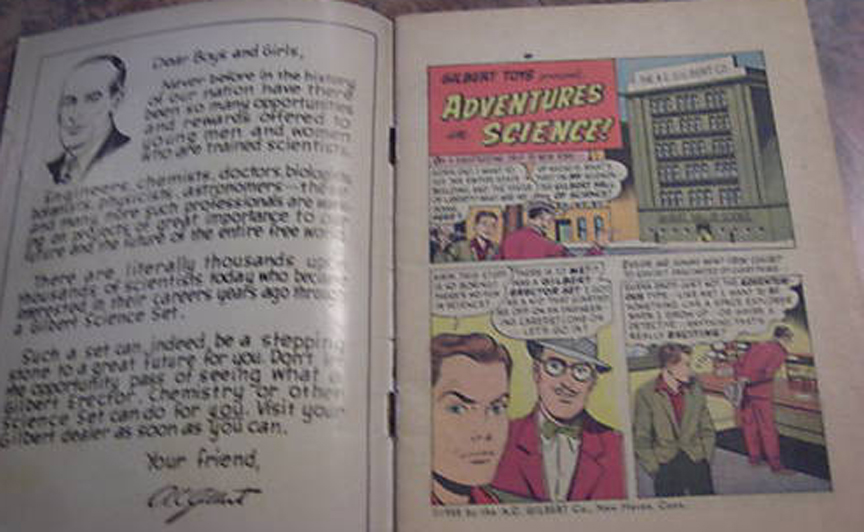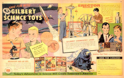 Small Town Kids Beat the Big City Smart-Alecks Thanks to Gilbert... Incomprehensible as it may seem in 2010, Big City Schools were the best in 1959... The comic (far right) also provides a foretaste of the CSI series... Click to Enlarge Although the comic is quite fanciful, it provides one interesting sociological observation. In the 1950s, the Big City schools were the best in the nation. People from outlying communities would have their child board with a city relative to obtain entrance to the Good Schools. When I was a kid, I would look at the science laboratories in the city schools with awe. In 2010, the notion that City Schools are a vast reserve of knowledge about anything other than drug dealing is an absolute hoot. In spite of zillions of dollars tossed at them, most city schools can't even get their teachers to read at 8th grade level. I expect to hear outraged howls from the teachers' unions along with the chorus of Concerned Moms, so I'd better stop. Although, maybe the Concerned Moms might want to take on the Unions -- they can use their Lawyers to keep kids from putting Erector set parts in their mouths, but they don't use their Lawyers to keep the schools from putting condoms in their hands (or heroin in their veins)... I would also like to see the Friends of the Wolves duke it out with the Friends of the Deer... We have scanned this comic and make it available to you, free of charge. Just click on the hyperlinks below; be sure to "save" the document on your machine before opening it! Gilbert used this theme in the mass media as well. Here's an ad from Boys Life, every 13-year-old's journal of reference: ![]() The Reds are Bad! Science is Good America's fascination with scientsts lasted just until John Glenn went into orbit... As you can see, all of these All-American boys are having a wonderful time playing with their varied A.C. Gilbert toys. I had most of them, the Microscope kit, the Chemistry set, but not American Flyer trains (We were a Lionel household...) More on these other toys later. Note that the "Walking Giant" is manifesting himself in the upper right hand corner. In order to build Mr. Giant, you had to have the "Number 12 1/2" set. (More about those 1/2 things below). This cost $70 dollars when $1 an hour was a good wage; the mortgage for most people was $70/month. As near as I can figure it, this thing would cost about $2,400 in today's dollars. Needless to say, the "Number 12 1/2" set remained out of my grasp for a LONG time. ![]() Mr. Giant is more "show" than "go" This graphic really touches on the 12-year old boy's mind A.C. Gilbert was a Princeton and Yale scholar, won a gold medal the Olympics in the pole vault, and was a phenomenal businessman. It could be said that he truly "knew boys." Everything that he did or made appealed to the curiosity and fantasies of boys aged 6-16. He made a fortune.