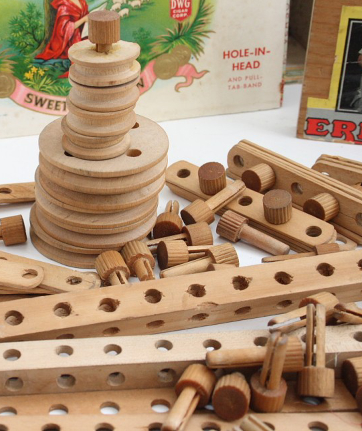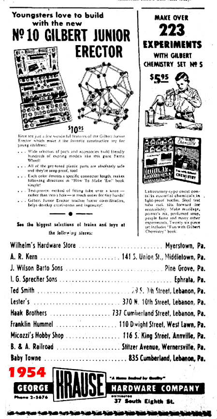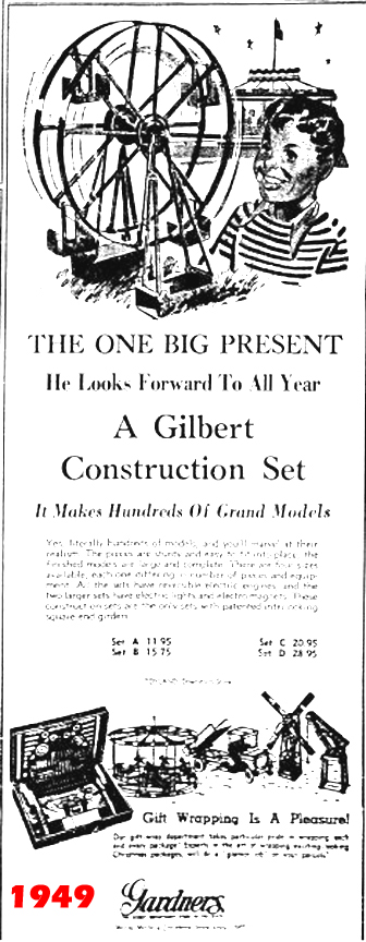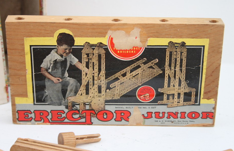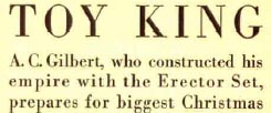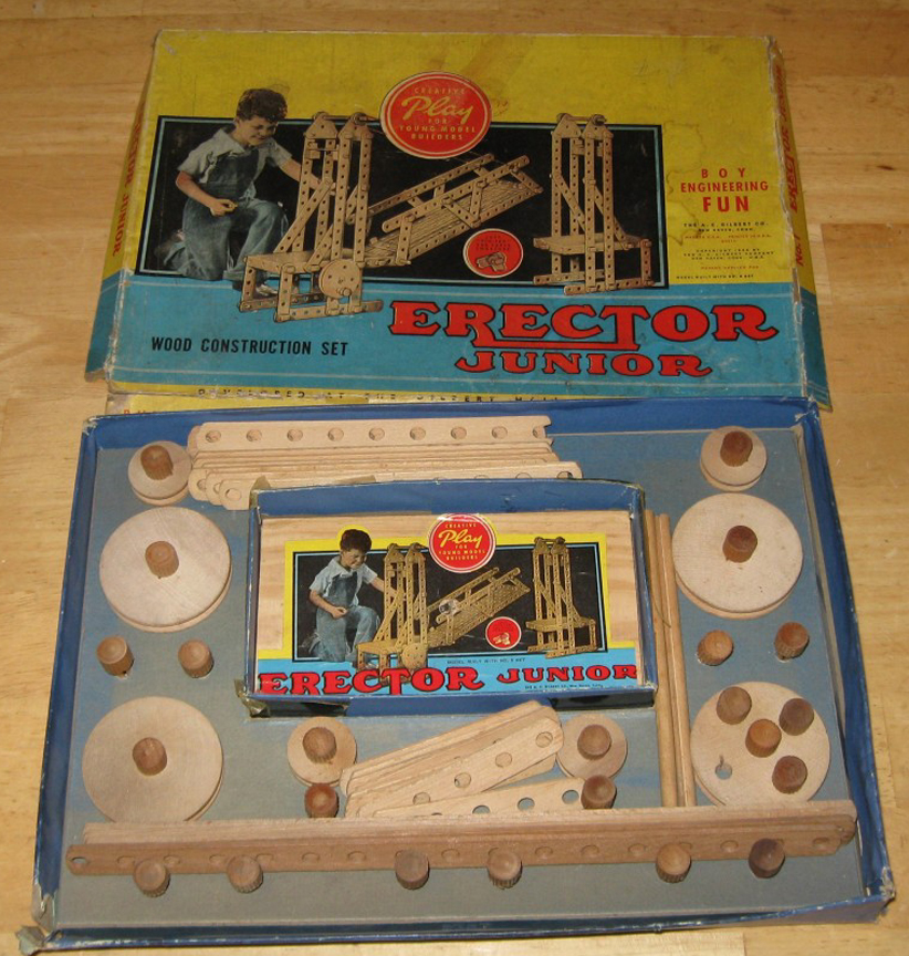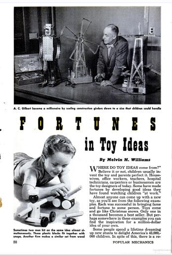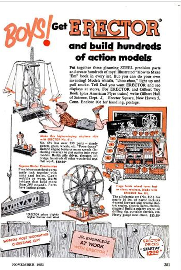 Details of the Wooden "Erector Junior" Set Alas, by 1954 the Erector Junior was made of safe, "gay-toned" plastic Click to Enlarge In 1953, Mr. Gilbert was featured in an article entitled "Fortunes in Toy Ideas" that appealed to the basement inventors who formed the reader base for that magazine. You may Click here to read a ".pdf" of the article. Although Gilbert's picture leads off the article, you don't hear about him until the next to last paragraph. Of all things, an Erector Set ad is directly next to this paragraph -- product placement, 1953 style.