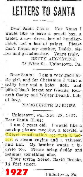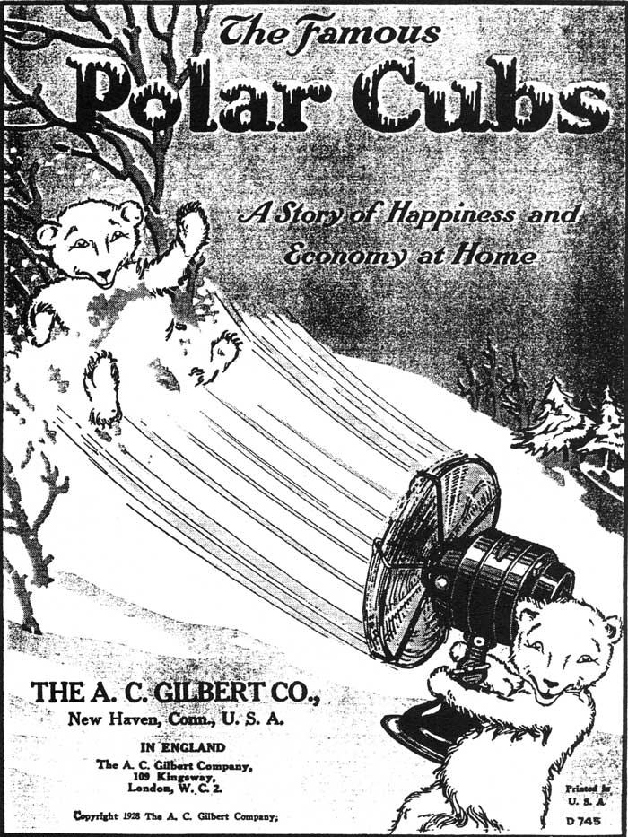 Click to Enlarge< Click to download the entire Adventures in Science Advertising Comic Book Thousands of Boys wrote regularly to Mr. Gilbert, confiding in him as a second father. Gilbert took pride in saying that he had "thousands of sons." Alas, Mr. Gilbert was not that close to his own family, but that's another story. One of Mr. Gilbert's best kept secrets was that he made Girls' Toys. This may come of a shock to those of you who may have bought into the "Boys!" advertising line. The truth of the matter was that Mr. Gilbert was eager to get into any business that made money, especially one that would keep his factories busy. Mr. Gilbert set up the LaVelle Toy Company as a separate entity and went through some accounting gymnastics to keep LaVelle completely separate from the Gilbert enterprise. This was "separate" only in the legal sense. The LaVelle offices were located on Fox Street just behind the main Erector plant. The name "LaVelle" was selected because it was the name of Mr. Gilbert's sister-in law, wife of his brother Frank W. Gilbert. Lavelle toys were manufactured during the mid 1920s and were targeted at "traditional" or "stereotyped" female roles, such as the "Little Laundress" kit and others shown below. Thanks to Randy Sauder for help with the origins of the name "LaVelle" and photos of the ultra-rare LaVelle kits ![]() LaVelle "Little Laundress" Set Image courtesy of Randy Sauder Click to Enlarge ![]() LaVelle "Millinery" Set Image courtesy of Randy Sauder Click to Enlarge ![]() LaVelle Nurse Set Image courtesy of Randy Sauder Click to Enlarge Mr. Gilbert also entered the children's record business, which was highly competitive. Gilbert's record lable (Bob-O-Link) was accused of price manipulation to obtain market share. Both LaVelle and Bob-O-Link lines were dropped in the late 1920s. I'd like to take a minute to show some "other" toys so that you can contrast them with the Erector Set. It was customary for the Science and Mechanics magazines to publish an article on "New Toys" in their December issue. I have managed to find three of these: 1931, 1946, and 1952. Take a look at them and decide for yourself whether (or not) the Gilbert construction and science sets were really a "cut above." ![]() The 1931 Toy Preview From the "January" 1931 Issue of Modern Mechanics Modern Mechanix Issues were dated by the time they would be removed from the newsstand That is, the January 1931 issue would be on sale during December 1930 up to January 1 1931 ![]() The 1946 Toy Preview - First New Toys after WWI Restrictions Were Lifted Gilbert Chemistry Sets and American Flyer Trains Got a Special Mention From the December 1946 Issue of Popular Science Popular Science Issues were dated by the time they were offered on the newsstand That is, the January 1946 issue would be on sale during December 1946 and would be removed on January 1 1947 ![]() The 1952 Toy Preview From the December 1952 Issue of Science and Mechanics Science and Mechanics Issues were dated by the time they were offered on the newsstand That is, the December 1952 issue would be on sale during December 1930 and would be removed on January 1 1953 Click on any photo to Enlarge It Read the 1931 article Read the 1946 article Read the 1952 article Occasionally, files held on the server may be corrupted-- if you find that this is the case with your download, please contact me and I'll send you the correct file. Since the Toy Business was quite seasonal, Mr. Gilbert used his factories to manufacture a number of household appliances. Among the most recognizable were the Polar Cub Fans, an item that could be made in the winter and sold in the Summer, just as toys were made in the summer and sold (mainly) at Christmas.