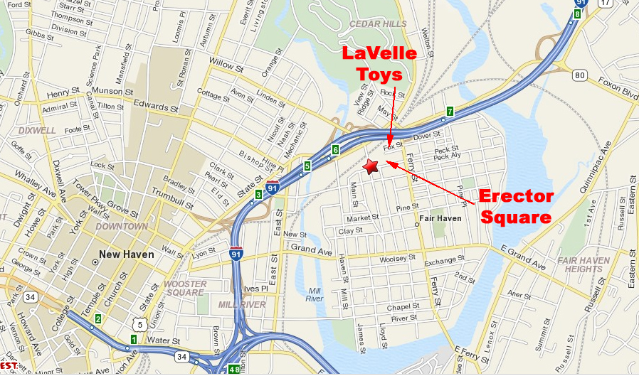 Map Showing the Gilbert Factory in New Haven, Connecticut Note that the LaVelle Toy Co. Adjoins Erector Square... Click to Enlarge Note that the LaVelle Toy Company on Fox Street is just behind the Erector Complex. Mr. Gilbert went out of his way to keep his connection with Girls' toys very distant from the Erector mythology, but very close at hand for manufacturing and distribution efficiency. Visit the Eli Whitney Museum in New Haven, Connecticut The Eli Whitney Museum is devoted to the study of invention and innovation in industry. Most of the space is devoted to Eli Whitney and his methods of standardized mass production. However, there is space devoted to New Haven's other commercial genius, A.C. Gilbert. I visited the museum in the summer of 2010 and had a wonderful time chatting with the staff.