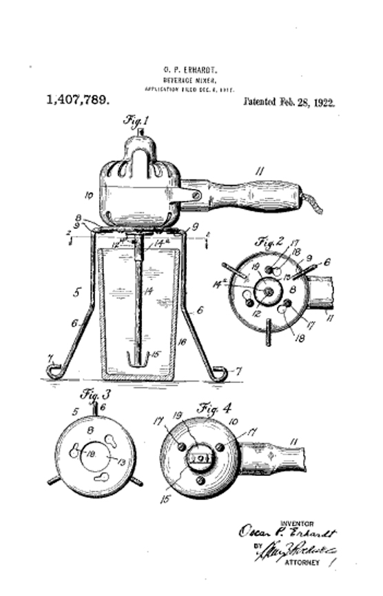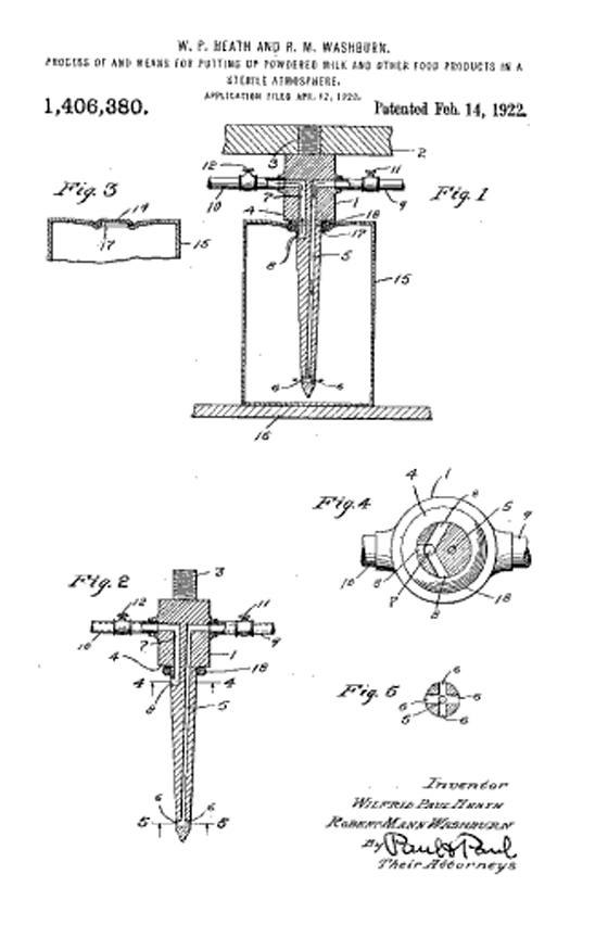 Both Ends of the Powdered Milk Cycle Heath's Powdered Milk Packaging and the Gilbert Reconstituting Mixer Patents No. 1,406,380 and 1,407,789 (Click here for a more detailed history of powdered milk in the 1920s.) Click to Enlarge For many families, powdered milk was one of the few options for providing wholesome milk to children on a daily basis, since refrigeration was severely limited. Since milk is an emulsion, simple stirring will not disperse the solids properly, leaving a gritty taste and clumps at the bottom of the glass. Further, even slight variations in drying temperature may caramelize the milk albumen, giving a "boiled" taste. Not long after the mass-marketing of powdered milk, the Gilbert company purchased a patent from Oscar Erhardt for a portable mixer. Mr. Gilbert's blender was then as important on the consumer end as Mr. Heath's patent was on the production end, enabling families to enjoy properly reconstituted milk (with additional flavoring to make up for deficiencies in the dehydration process.) However, the patent also contains another clause that would lead to further development of the Gilbert appliance lines: "... The primary object of the invention is to provide a simple, efficient, readily portable beverage mixer. More particularly, it is aimed to furnish a device in which the motor is not limited in its use to beverage mixing purposes, but can be readily detached from the other parts of the apparatus when it is desired to employ it for other purposes ..." Eventually, the portable mixer morphed into the Dari-Rich that became a runaway best seller. Some Gilbert enthusiasts even suggest that this may be one of the companies largest selling appliances. Here are some photos of one of the more "mature" versions: