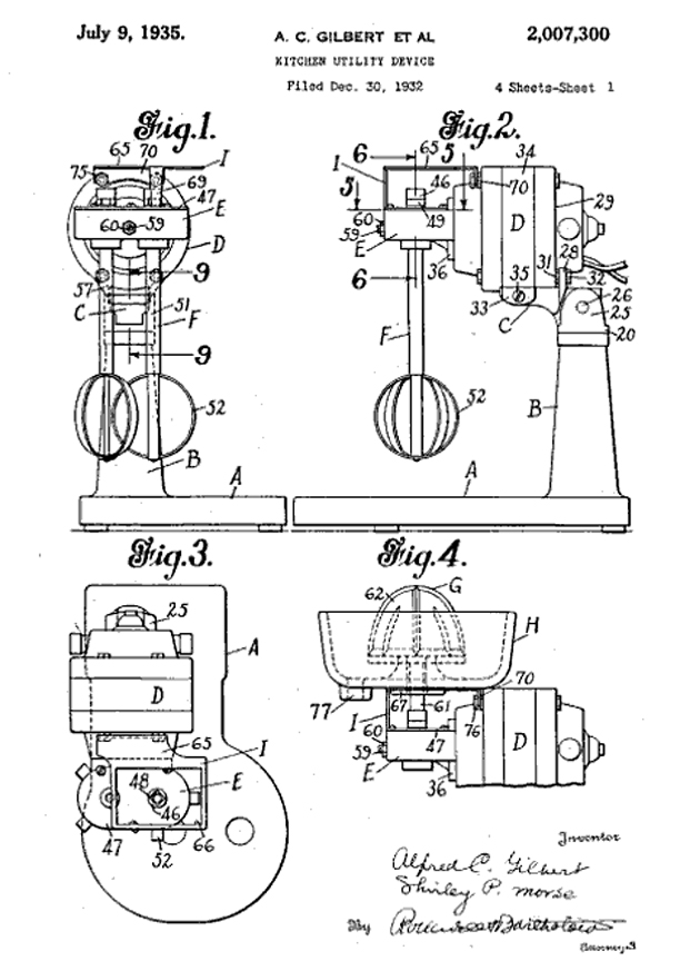 The Kitchen Stand Mixer Patents No. 2,007,300, 2,027,036, and 2,247,708 Click to Enlarge In addition to earning a medical degree from Yale, an Olympic Gold medal, the worlds championship in chin-ups, and building a multi-million dollar company, Mr. Gilbert also invented the sex toy. Whether it be fan, mixer, or blender Gilbert's appliances were just an electric motor hooked to something. Note that one of the key points of Erhardt's blender patent (above) is that the motor can be used for "other purposes". Below, you will find Mr. Gilbert's patent No 1,668,364 (May 1, 1928) for The Vibrator, indicating that by 1927 or so, he had discovered yet one more "other" purpose. ![]() Patent for a "Vibrator" Click Photo to Enlarge It You'll note that the Vibrator was patented after the Dari-Rich, but before the Fan and quite a bit before the stand mixer. Clerly, Mr. Gilbert had the vibrator in his thoughts early on in the electric appliance business.