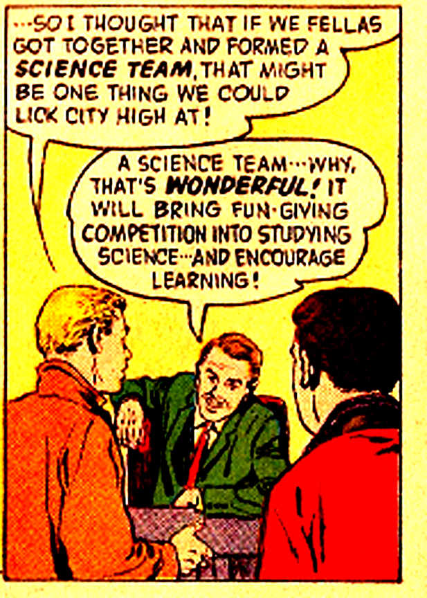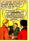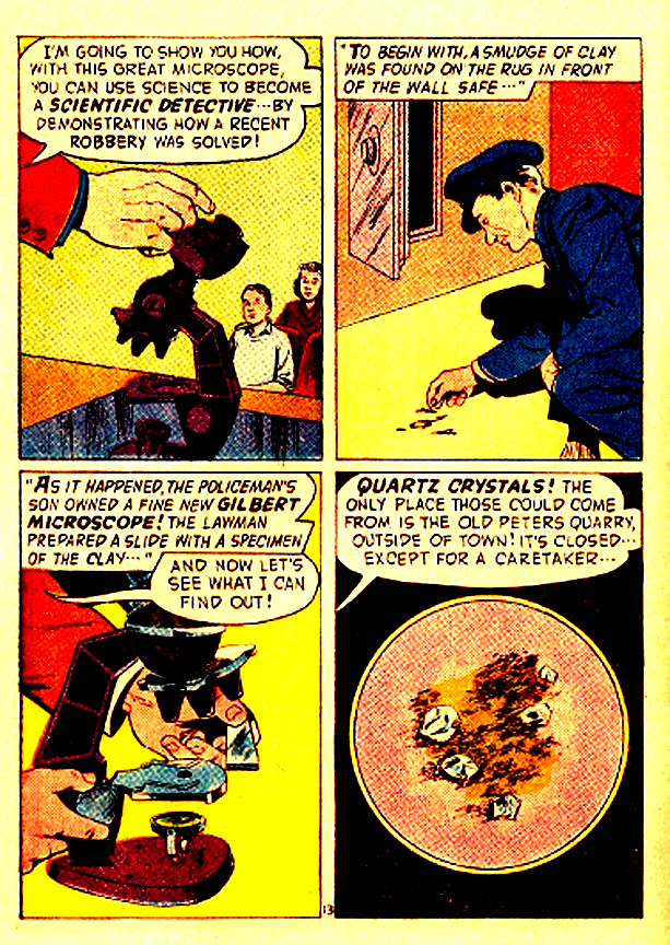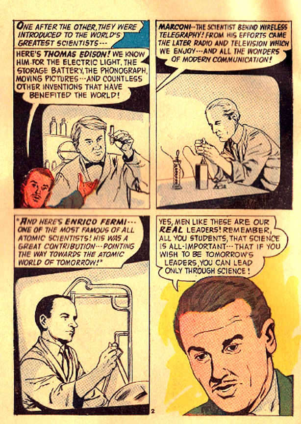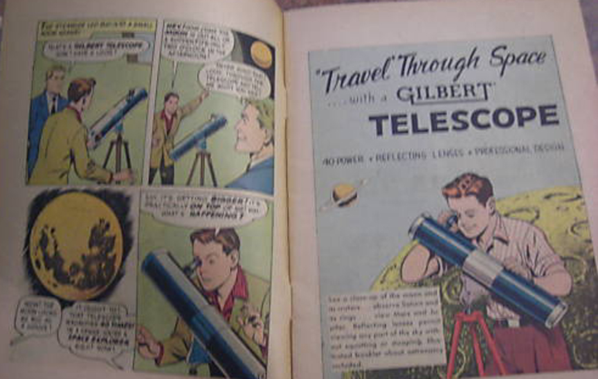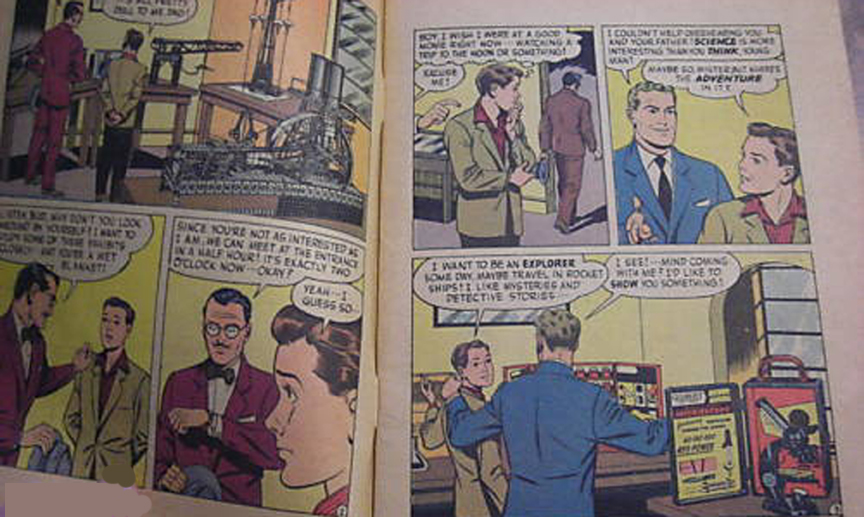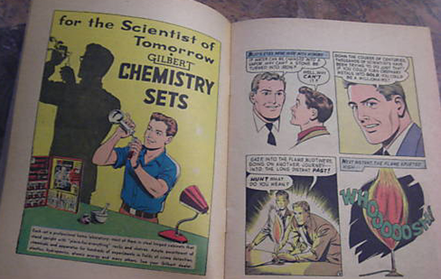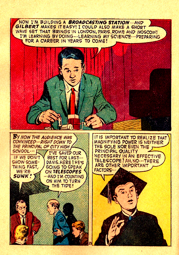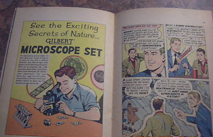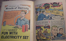 Mr. Gilbert had a wide variety of contests, broadcasts, and membership clubs that gave the Boy a place to Belong. He opened the Gilbert Hall of Science in New York as a Mecca for Boys. Here are pages from a comic book/ad from the 1950s. The story begins when the Boy is bored witheverything while Dad (the guy with the mustache) frets about ways to move the Boy onto a productive career track. Dad finally drags Boy to the Gilbert Hall of Science and places him in the hands of a smooth shaven "Space Traveler" who proceeds to show the Boy all kinds of amazing things involving Chemistry, Engineering and Astronomy. Interspersed with these feats of magic are full page ads for the products being used in the comic strips.