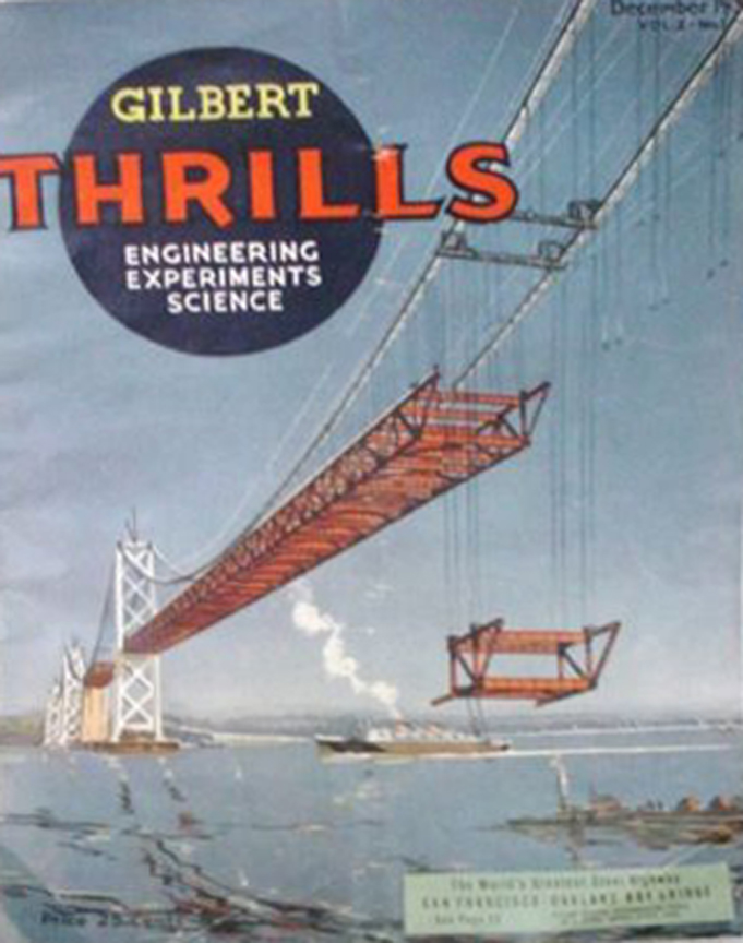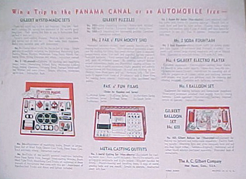 Excerpts from the Olympics Book Note that it continues the sales pitch... Click to Enlarge The Gilbert Company also made good use of the Boy's natural competitive instinct. They regularly held contests of all sorts, especially for new and astounding models that could be made with the Erector Set. Here is an ad for a contest that offered either a trip to the Panama Canal or a Free Car! Win a Trip to the Panama Canal Or a New Car... Click to Enlarge During the mid-1930s, the company published a magazine called Gilbert Thrills that presented contemporary feats of engineering to wide-eyed boys. Of course, the ads reminded the Boy about all the things that he could construct on his own with a Gilbert construction kit.