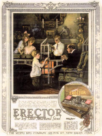 Letterhead and Gilbert Signature from the "Mysto Magic" period Click to Enlarge Gilbert began his connection with the Toy industry by pursuing his favorite vocation -- as a Magician. Although he was a Yale-trained doctor, he began pursuing a career in Magic. he was so good at it that he was asked to join the "Mysto" Company that made and distributed "Magic Sets" to kids, teaching them elementary illusions. Gilbert lived in New Haven, but commuted regularly to New York to fulfil his duties to Mysto. As he rode on the train, he observed the steel structures being created to hold the wires for the new electric locomotives. These structures, made of a latticework of girders, were the inspiration for the Erector set. Girders on New Haven Railroad That Inspired the Erector Set Click to Enlarge When the government tried to prevent him from making Erector Sets during World War One (October of 1917), he went to Washington and made the case that boys with Erector experience made better soldiers. For this reason, he is known as The Man Who Saved Christmas. There was a made-for-TV movie with that name, but Jason Alexander (the Seinfeld's sidekick) was cast as Gilbert. ![]() (l.) A.C. Gilbert in Princeton Athletic Regalia (r.)Jason Alexander Do these guys even remotely resemble each other??? Indeed, the Erector Set was the ideal Christmas gift for the Boy, adding parental approval to the Boy's dream of adulthood.