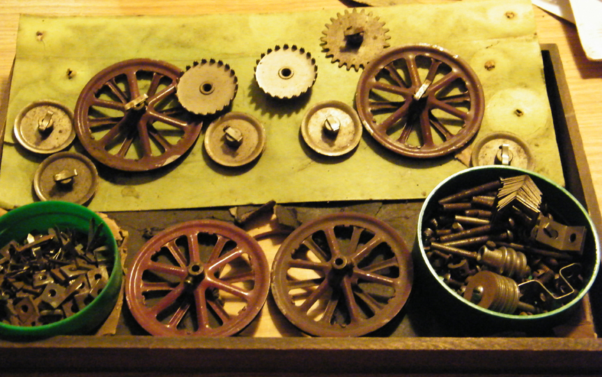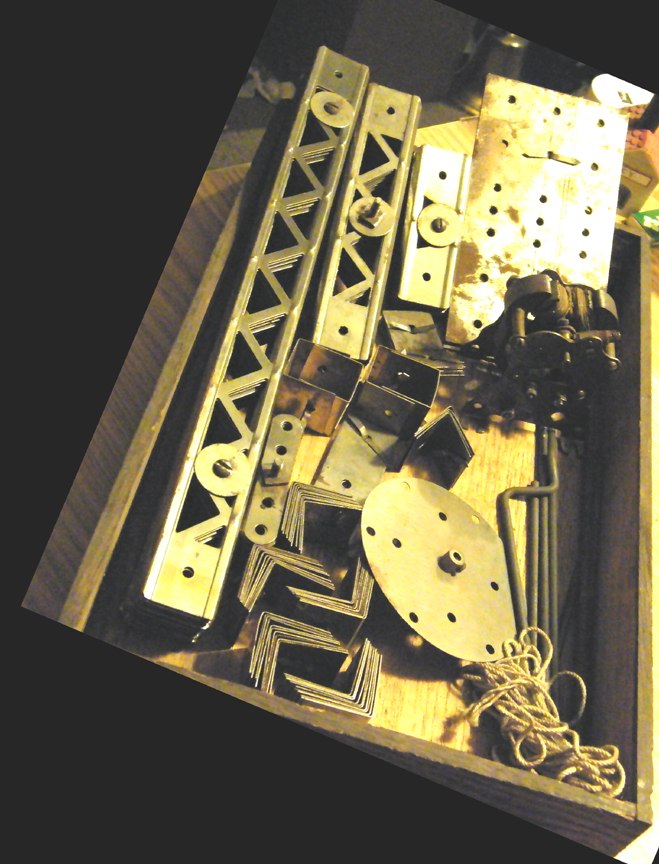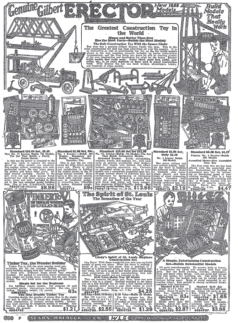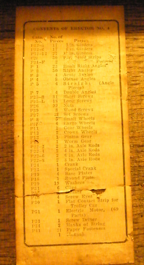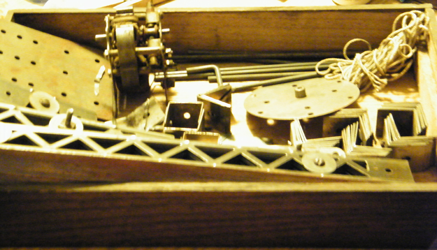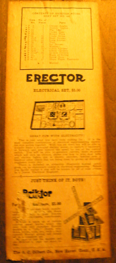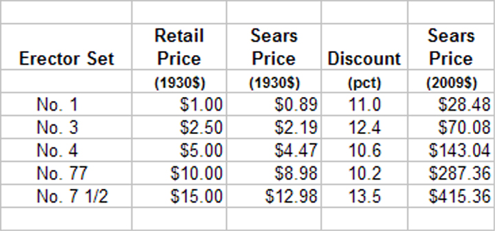 "Found Condition" Gilbert No. 4a Set Click Here to see a restored No. 4a Set The Sets were housed in an oak box Click to Enlarge Here is a video that describes a similar set in more detail: Here is an ad from the 1930 Sears Catalogue that shows the general variety of Erector sets that were available. The accompanying table show the discout that Sears was offering over the "normal" retail price, and an estimate of the cost of these toys expressed in 2009 dollars. We also note that Sears gave the heaviest discounts to the most and least expensive sets, probably because these were less likely to sell (the former because it didn't make many projects and the latter because it was quite expensive)
