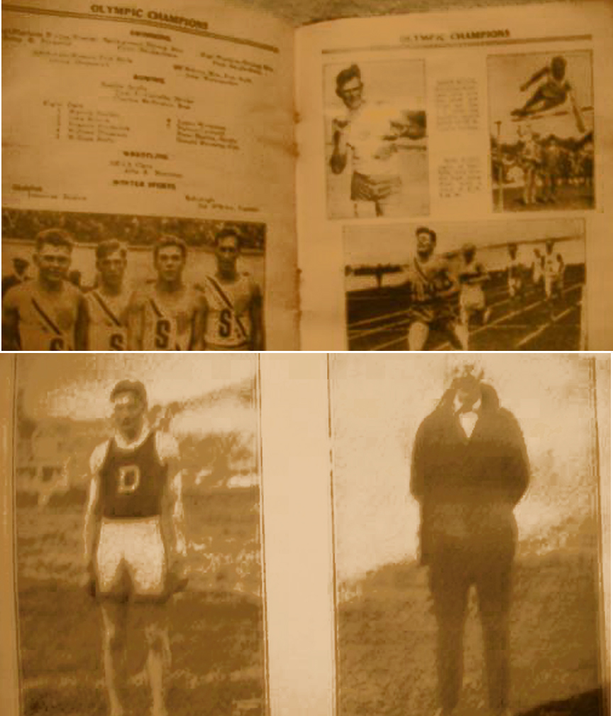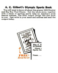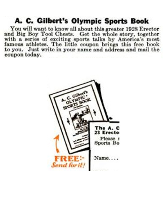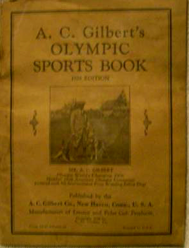 The Subtle Sports Pitch Click to Enlarge Once again, the familiar theme of Dad, Mom and the Pals is repeated: "BOYS! Here's your chance to give Mother and Dad a real surprise. Build furniture, airplanes, toys, birdhouses, and hundreds of other things... Lift the lid of the big red brass-bound Tool Chest and you open up a new world of exciting thrills. Call in your pals. Oh, boy! How their eyes will pop!..." BUT, that was only the opening sales pitch for the Gilbert "Big Boy" tool chest. But you'll that, hidden in the lower left corner is an offer for a free book about the Olympics. Recently, we obtained one of these books. This is a pretty dry compilation of records, but it reminds The Boy that Mr. Gilbert was an Olympic Medalist, proving that you can be a scientist, businessman, and athletic he-man at the same time.