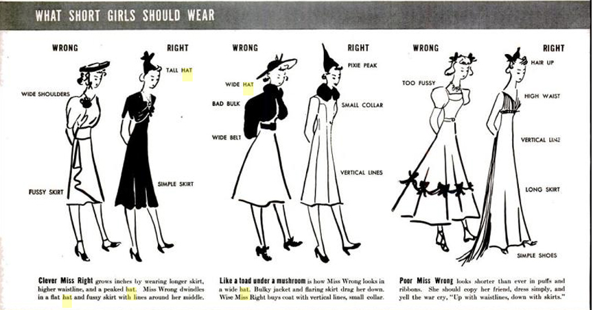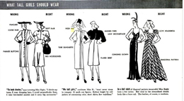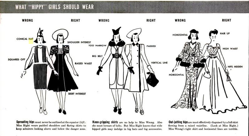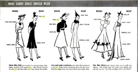 Here is an article from the August 22, 1938 issue of LIFE Magazine that gives some hints on how to dress well for ladies of all sizes and shapes. The suggestions are taken from the book Designing Women: the Art, Technique and Cost of Being Beautiful by Margaretta Byers and Consuelo Kamholtz. The drawings are followed by some real-life examples. You can enlarge each of the photos to read the text.