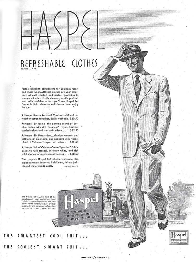 The ad for Haspel washable suits is from the February 1949 Holiday Magazine